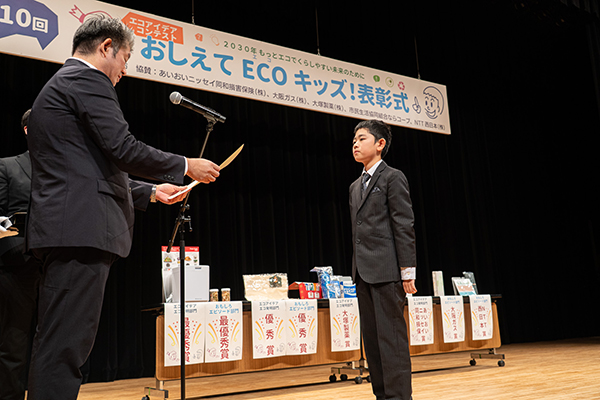 エコアイデアコンテスト「おしえてECOキッズ!」の表彰式は、市民ホールにて行いました。10回目となる「おしえてECOキッズ!」では、今年から企業協賛をいただけることとなり、これまでの、最優秀・優秀賞に加えて企業賞を創設。市長からの表彰状に加えて、エコに関連した副賞等も充実しました。例年通り、参加した入賞者一人ひとりがステージに上がり、奈良市長から表彰状が授与されるとともに、企業賞では、各協賛企業の方から受賞者に副賞が手渡され、各企業の方からコメントをいただきました。
