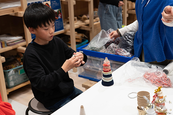 1階のエントランスでは、自転車発電体験や、太陽光発電に関するクイズとエコな電気を使って鉄道模型を走らせる体験。1階奥に昨年度にできたワークショップスペース「コトナラボ」では中学生による靴下わっか(靴下製造時に出る端材)を活用したクリスマスツリーやボトルホルダー作りが盛況でした。