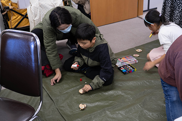 3階会議室はクラフトコーナー。お馴染みのひょうたんを使ったクラフトや、アフリカ布をつかったくるみボタン作り、奈良公園の木を使ったクラフト体験のほか、みつろうラップづくりと合わせて、紙芝居も行われていました。タネを使ったブローチでは、色々なタネの形に驚きながら制作している様子も見られました。木の実を使った楽器づくりには、終始、参加者が絶えず盛況でした。