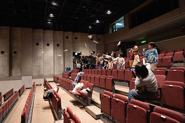 表彰式後の市民ホールでは、こちらも恒例の紙ひこうき飛ばし大会が開催されました。舞台上で奈良教育大学の学生スタッフのレクチャーのもと、広告紙などの再使用紙でそれぞれ紙ひこうきを制作。近畿大学FeeLinkの学生も応援に駆けつけてくれました。学生スタッフの合図で子どもたちが一斉に紙ひこうきを飛ばす姿は、とても活き活きとしていました。