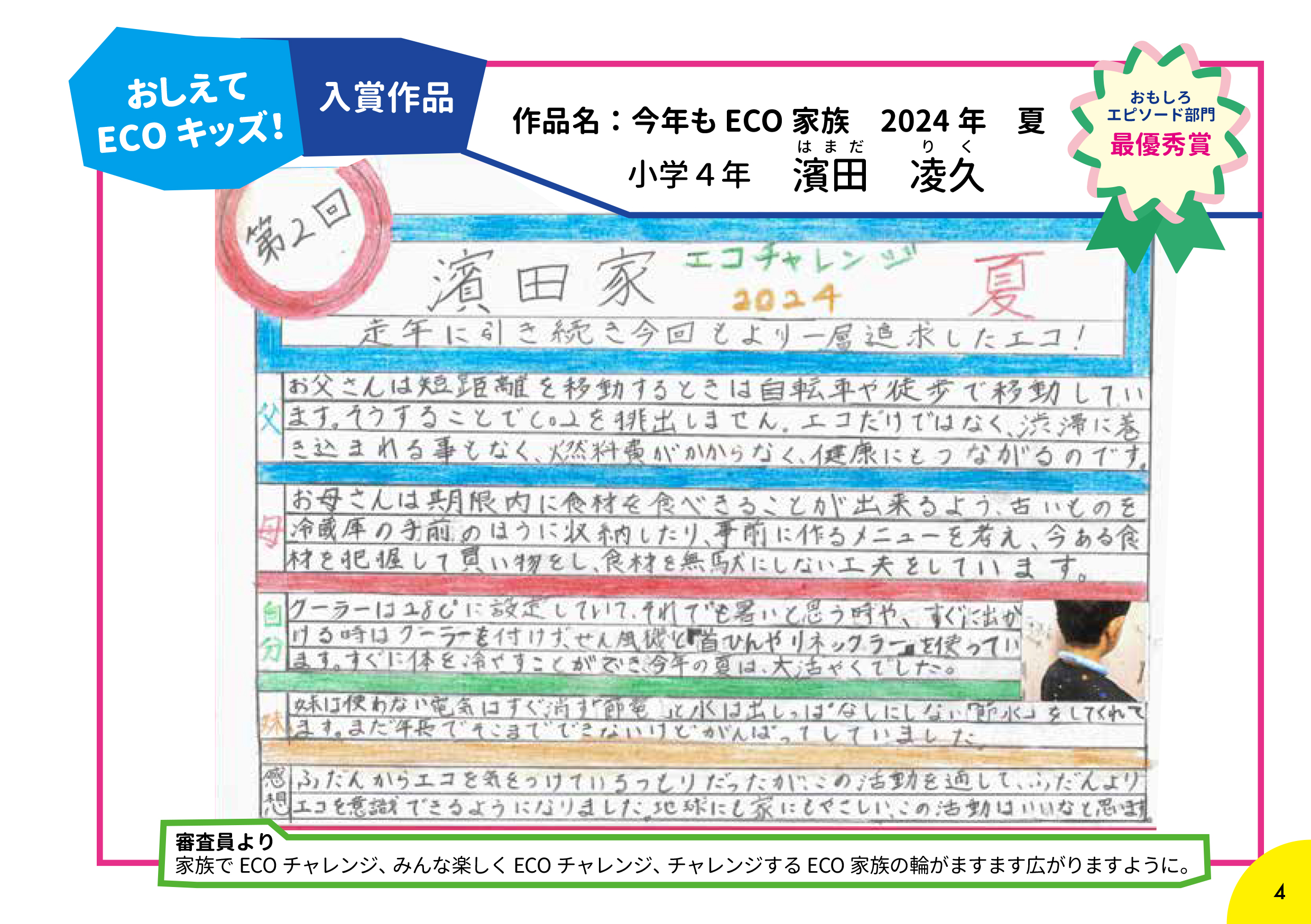 応募してもらった203作品の中から、エコアイデア・エコ発明部門、おもしろエピソート部門の合計11作品が入賞作品、14作品が入選作品として選ばれました。