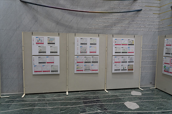 ならまちセンターの階段踊り場にて、作品の展示を行いました。子どもたちのユニークな作品を興味深く見つめる方々が印象的でした。