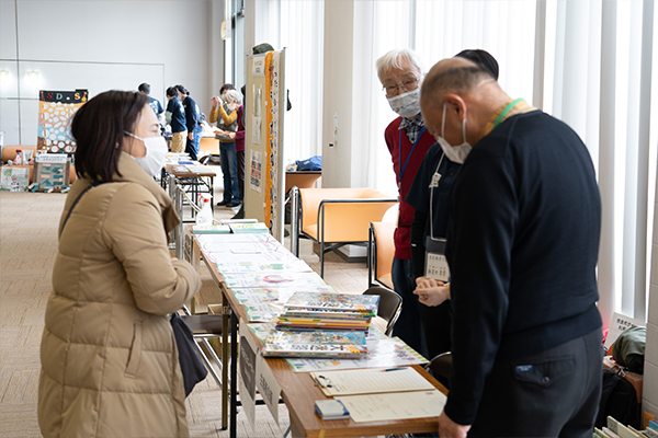 表彰式の行われる市民ホールのロビーでは、クイズや昔遊びなどの他、脱炭素の技術紹介、牛乳パックや靴下端材を利用したクラフトのほか、エコな暮らしに関するインタビューなどを行いました。また、絵本の回収ではたくさん方々から約100冊の絵本をお持ちいただいたため、その場で持って帰りたい方にお渡しするなど循環の場が生まれていました。