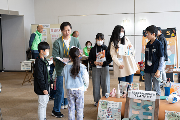 今年度も奈良教育大学の学生に当日運営をサポートしてもらいました。おしごと体験では、事前の打ち合わせから参画してもらい、進行などをお任せしました。ブース出展だけではなく、総合受付や主催者企画などにおいても活躍していただき、全体として運営もスムーズに進めることができました。