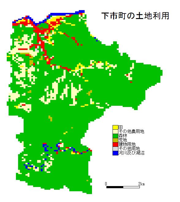 土地利用種と100mメッシュ数(下市町)