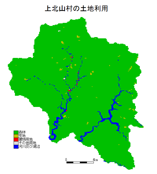 土地利用種と100mメッシュ数(上北山村)