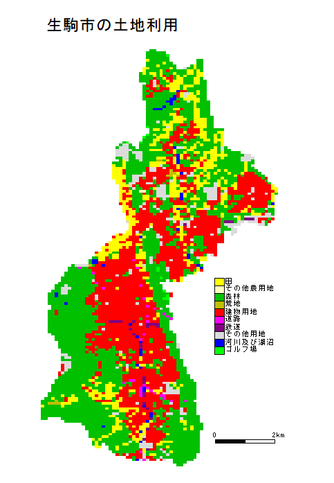 土地利用種と100mメッシュ数(生駒市)