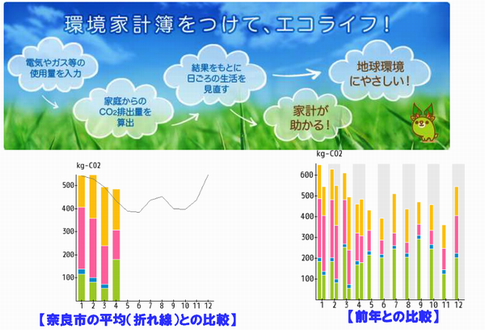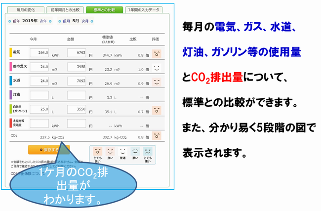 毎月、電気・ガス・ガソリン等の使用量を入力すると、CO2排出量を自動的に計算