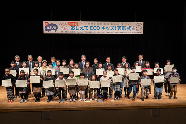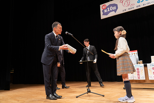 エコアイデアコンテスト「おしえてECOキッズ!」の表彰式は、市民ホールにて行いました。10回目となる「おしえてECOキッズ!」では、今年から企業協賛をいただけることとなり、これまでの、最優秀・優秀賞に加えて企業賞を創設。市長からの表彰状に加えて、エコに関連した副賞等も充実しました。例年通り、参加した入賞者一人ひとりがステージに上がり、奈良市長から表彰状が授与されるとともに、企業賞では、各協賛企業の方から受賞者に副賞が手渡され、各企業の方からコメントをいただきました。