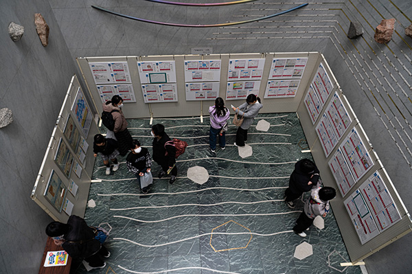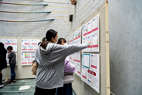会場の階段踊り場にて、今年の優秀作品の展示を行いました。表彰式に訪れたご家族だけでなく、図書館を訪れた方、イベントへ参加された方が真剣に見てくださるのが印象的でした。