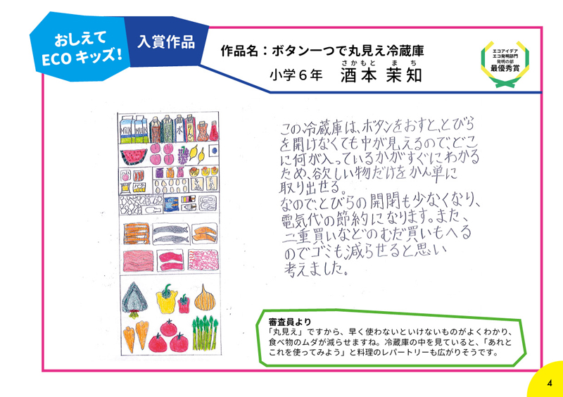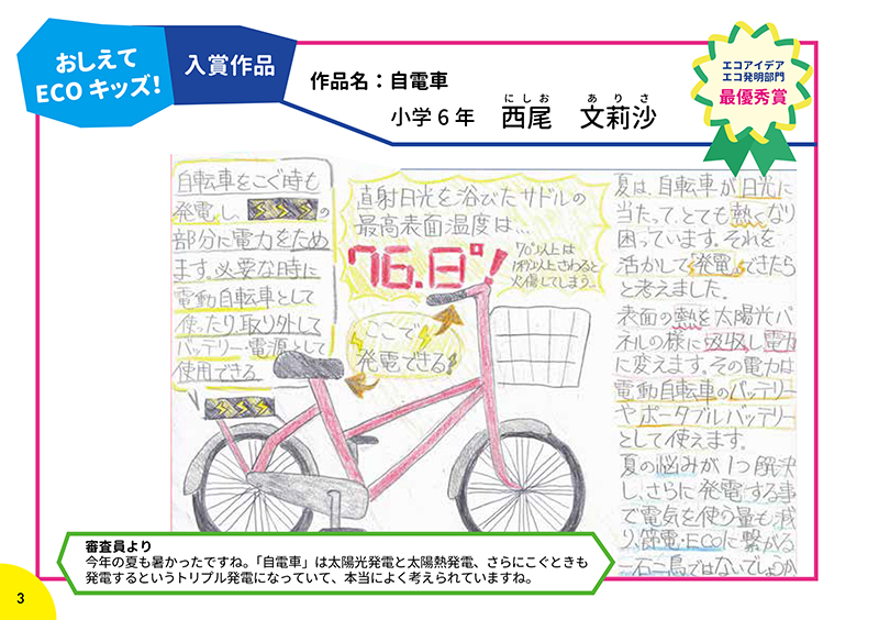 応募してもらった260作品の中から、エコアイデア・エコ発明部門、おもしろエピソート部門の合計14作品が入賞作品、18作品が入選作品として選ばれました。