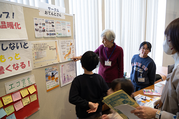 2階の表彰式会場となる市民ホールのロビーでは、エコな学びや遊びの体験ブースが出展。食品ロス防止・フードドライブなどの取り組みをはじめ、昔遊びや旬当てクイズ、生き物クイズなど楽しくエコについて学べるほか、メタネーションなど新たな環境技術を学ぶ場となりました。また、ラジオのインタビューで多くの来場者の方の「取り組んでいるエコなこと」を伺う様子もみられました。