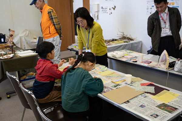 3階会議室はクラフトコーナー。お馴染みのひょうたんを使ったクラフトや、アフリカ布をつかったくるみボタン作り、奈良公園の木を使ったクラフト体験のほか、みつろうラップづくりと合わせて、紙芝居も行われていました。タネを使ったブローチでは、色々なタネの形に驚きながら制作している様子も見られました。木の実を使った楽器づくりには、終始、参加者が絶えず盛況でした。
