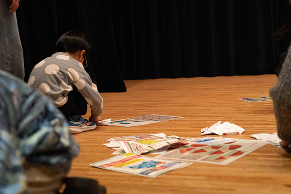 表彰式後の市民ホールでは、こちらも恒例の紙ひこうき飛ばし大会が開催されました。舞台上で奈良教育大学の学生スタッフのレクチャーのもと、広告紙などの再使用紙でそれぞれ紙ひこうきを制作。近畿大学FeeLinkの学生も応援に駆けつけてくれました。学生スタッフの合図で子どもたちが一斉に紙ひこうきを飛ばす姿は、とても活き活きとしていました。