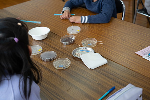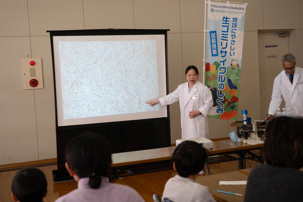 菌の力を借りて食べ残しをリサイクルする仕組みを学ぶ講座を、講師・アサヒバイオサイクル(株)さん、運営協力・NTT西日本(株)さんに開催してもらいました。顕微鏡を使って、微生物の働きを観察。見学に来ていた保護者の方も一緒に体験をしました。
