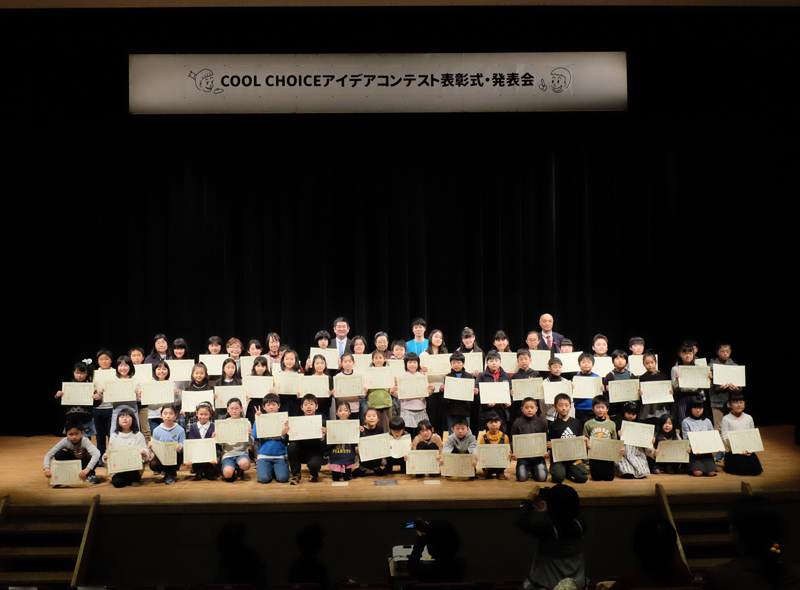 その後、いよいよ「おしえてECOキッズ」の表彰式です。最優秀、優秀の子どもたち一人一人に市長から賞状が授与され、一人一人が作品についてのコメントをしてくれました。最後に子どもたち全員がステージに上って記念撮影となりました。