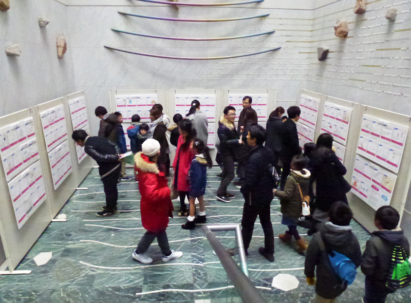 寒さの厳しい1月14日、ならまちセンターにて「おしえてECOキッズ!」表彰式・発表会に合わせて、「あつまれECOキッズ!」が開催され、エコを楽しく学ぶ一日となりました。ならまちセンターの中央階段には、「おしえてECOキッズ!」の応募作品中、最優秀、優秀、入選、佳作までの合計154作品が展示され、多くの方々に子どもたちのエコなアイデアやエピソードを楽しんでいただけました。
