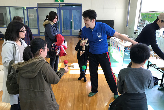 同じ2階の多目的室は、「エコな遊び」がテーマです。電気を使わない遊びとして、体を使ったゲームや、自然を学ぶネイチャーゲーム、懐かしのけん玉やお手玉、紙ヒコーキ作り体験のほか、太陽光で充電した電池で動かすプラレールなどの体験を楽しんでもらいました。