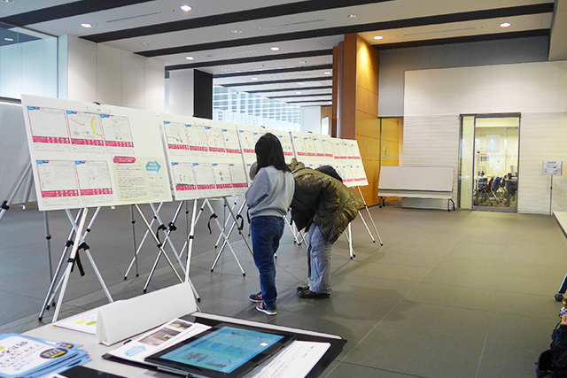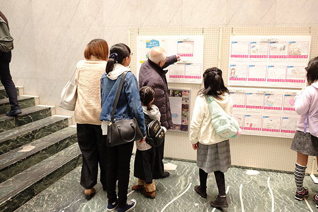 すっきりと晴れた1月13日、昨年と同様、奈良市ならまちセンターにて「おしえてECOキッズ!」表彰式・発表会と、合わせて「あつまれECOキッズ!」が開催されました。ならまちセンターの中央階段踊り場には、「おしえてECOキッズ!」の応募作品中、最優秀、優秀、入選、佳作までの合計80作品が展示され、多くの方々に子どもたちのエコなアイデアやエピソードを楽しんでいただきました。