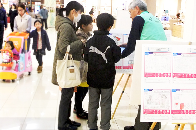 ホール前のロビーでは、エコに関する展示や、取り組み紹介、エコクイズや紙芝居のほか、ぬいぐるみの交換市なども行いました。
