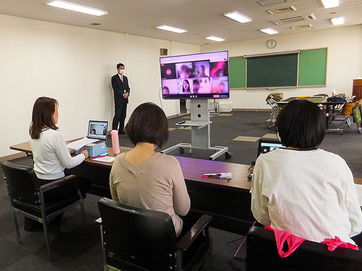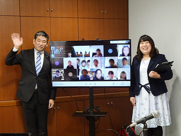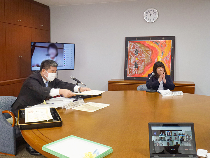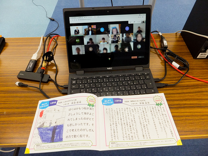 COOL CHOICEアイデアコンテスト「おしえてECOキッズ!」の表彰式は、市役所の「キャンベラの間」と受賞者の各家庭をつなぐオンラインでの開催となりました。今年は、新型コロナウイルスの感染拡大の影響で、オンライン授業に関する整備が進んだこともあり、学校から貸与されたタブレットを利用して参加する子どもたちもたくさんいました。