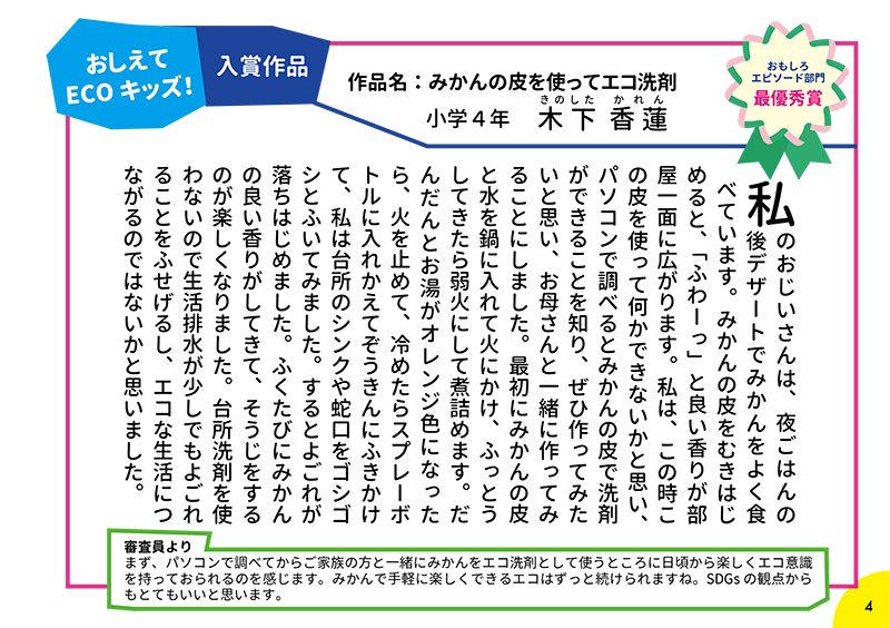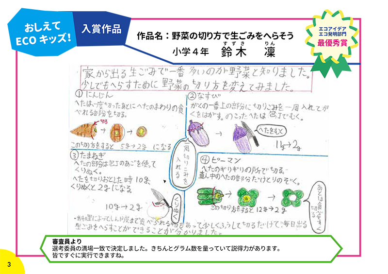 「おしえて ECO(エコ)キッズ!COOL CHOICEアイデアコンテスト」ご応募ありがとうございました!応募してもらった172作品の中から、エコアイデア・エコ発明部門、おもしろエピソート部門の合計13作品が入賞作品、18作品が入選作品として選ばれました。