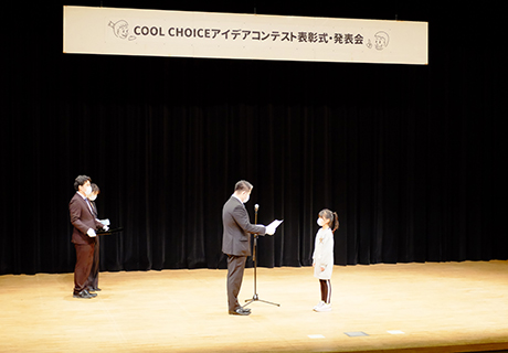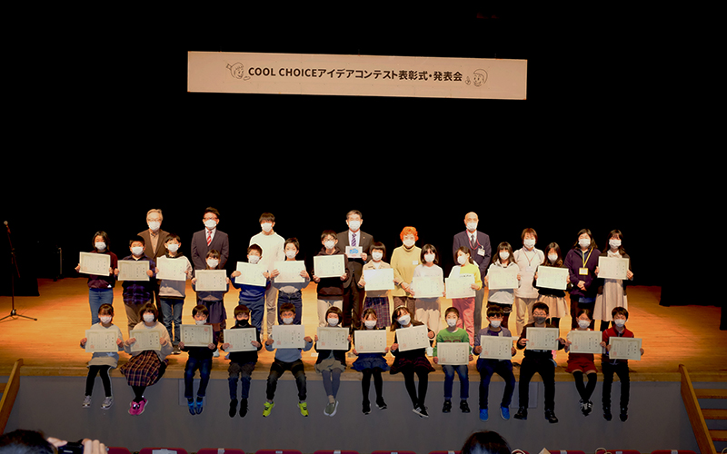 COOL CHOICE アイデアコンテスト「おしえてECOキッズ!」の表彰式は、ならまちセンターの市民ホールにて行いました。例年通り、参加した入賞者一人ひとりがステージに上がり、奈良市長より表彰状が授与されました。保護者をはじめたくさんの方々が見つめる中、緊張の面持ちで賞状を受け取る姿が印象的でした。