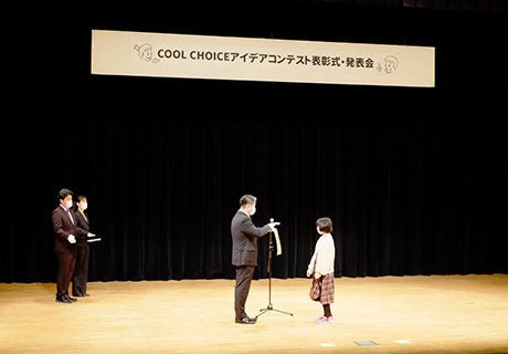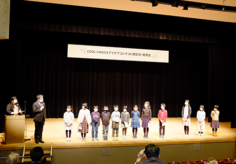 賞状授与の後は最優秀賞・優秀賞の皆さんから、それぞれのアイデアやエピソードについて発表していただきました。身近な暮らしの中で実践できるエコなことや、普段の暮らしの中でもっとエコになるアイデアを自分たちのことばでしっかりと発表してくれました。