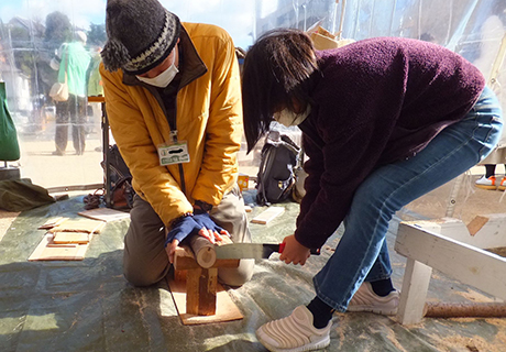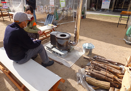 屋外の芝生広場では、太陽光パネルを使った発電の実践やソーラークッカーの活用、お馴染みの自転車発電のほか、薪ストーブで暖を取れるようにするなど、さまざまなエネルギーのあり方を体験できるようにしました。また、直径15センチ程度の丸太をノコギリで伐る体験では、白い息を吐いて懸命に木を伐る姿が印象的でした。