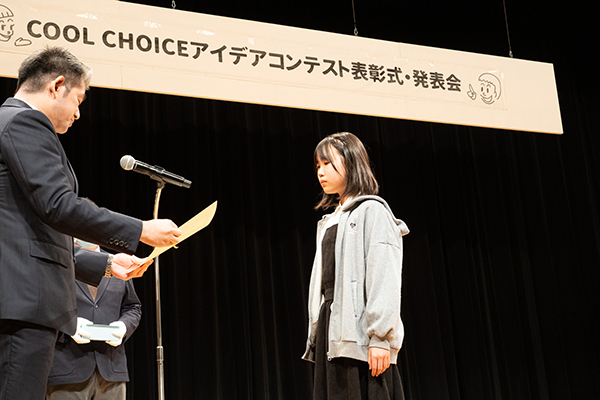 賞状授与の後は最優秀賞・優秀賞の皆さんから、それぞれのアイデアやエピソードについて発表していただきました。受賞者の皆さんのコメントがいずれも自分の暮らしの中で実感した暑さなど異常気象対策・食品ロス対策などのアイデアが多く、しっかりと自分の考えを持って発表されていたのが印象的でした。