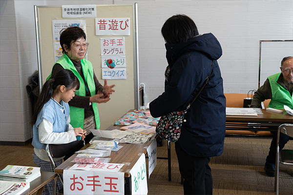 昔あそびをしよう!電気を使わない昔遊びの楽しさの体験。また、どちらがエコかを考えるクイズも実施 【奈良市地球温暖化対策地域協議会(NEW)】 |