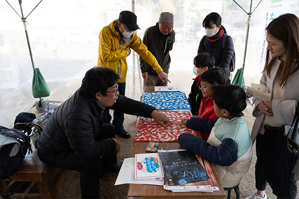 表彰式の行われる市民ホールのロビーでは、クイズや昔遊びなどの他、脱炭素の技術紹介、牛乳パックや靴下端材を利用したクラフトのほか、エコな暮らしに関するインタビューなどを行いました。また、絵本の回収ではたくさん方々から約100冊の絵本をお持ちいただいたため、その場で持って帰りたい方にお渡しするなど循環の場が生まれていました。